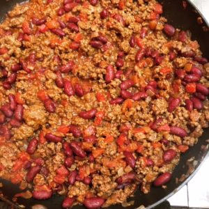 Once the meat was browned and the onions were soft, I added the spices (cumin, chili powder, paprika, salt and pepper), a can of dark red kidney beans, a can of diced tomatoes with green chiles and a small can of tomato sauce. I let it simmer and cook down while I fried the bread.